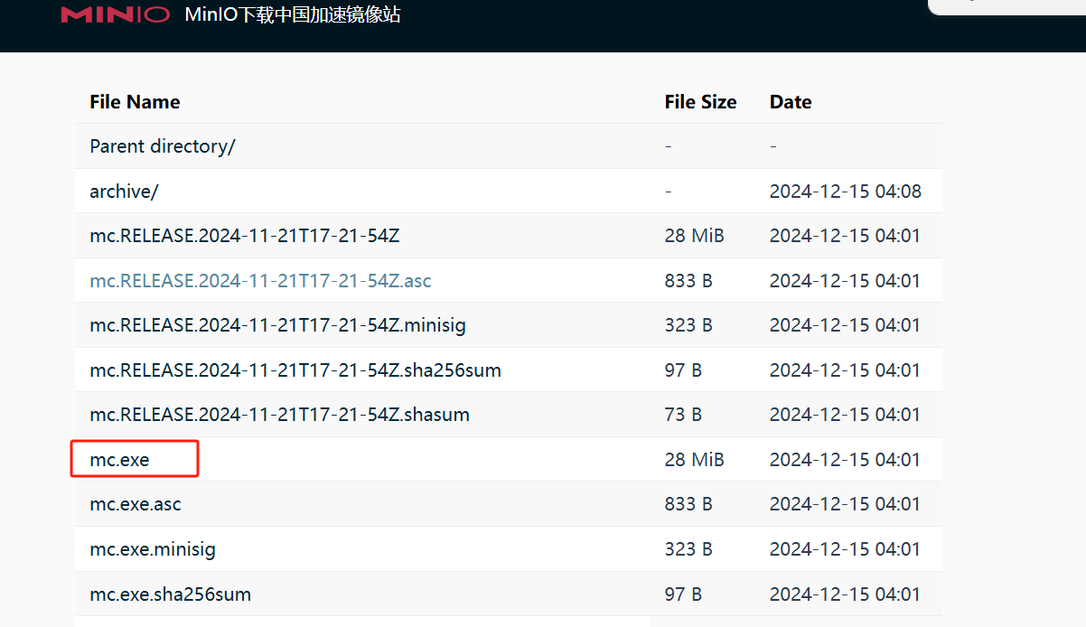 中国加速镜像站:http://dl.minio.org.cn/client/mc/release/windows-amd64